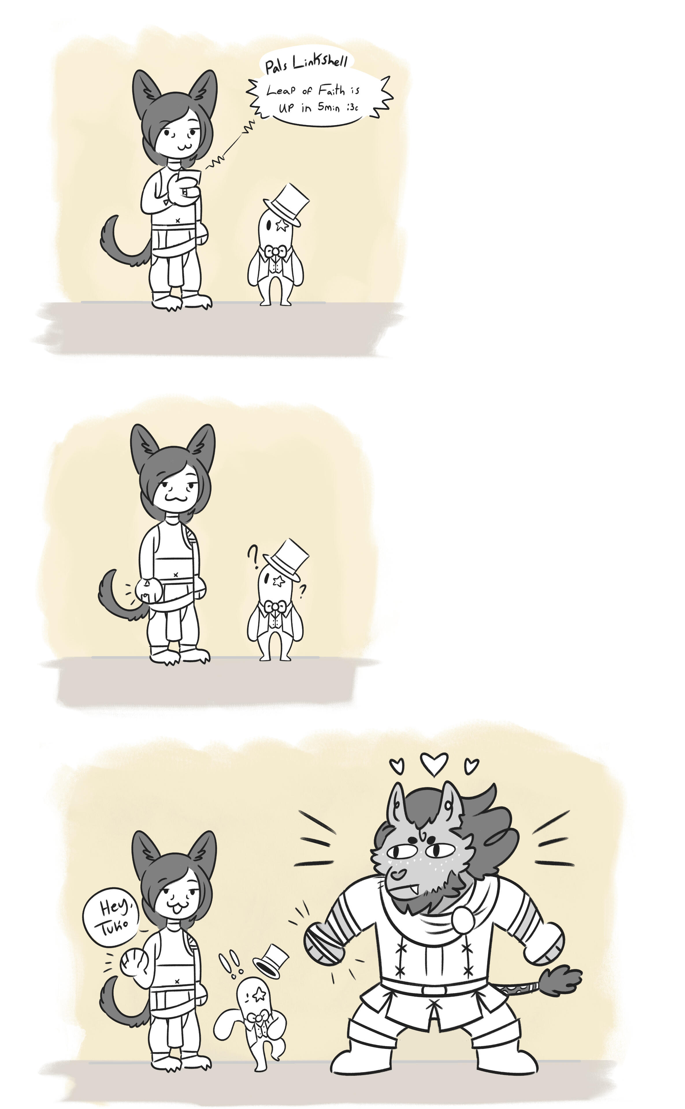 ♥ ♡ ♡ ♡ ♡The first time the two met, they were both greenhorns in the Lancer's Guild, unused to adventuring and the particular discomforts of Gridanian society. While their paths diverged as they both honed their skills, they bumped into each other again years later as Scions in the Rising Stones and easily rekindled their friendship, bonding over their love of dance.Also, Tuko has promised to teach him how to fish![ Player ]Married 10/16/2021 for tax benefits (aka cute clothes)